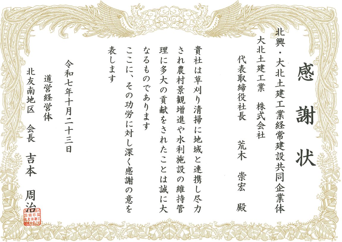 北友南地区より感謝状を頂きました。